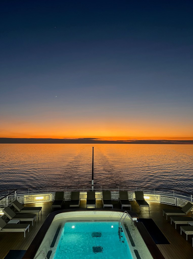 Our first day was a lazy one at sea. I rose for the sunrise, had breakfast with Emily on the deck, then we went to a stretch class together, followed by an aqua aerobics class.