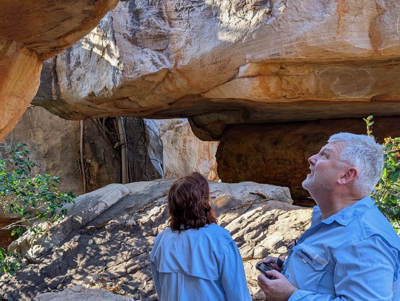 Sharing images of the rock art on social media is not respectful, but here’s a pic of us looking at it …