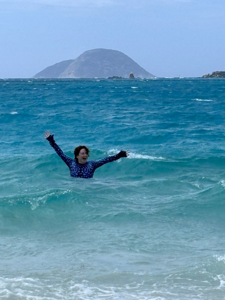 This is an unofficial photo of me splashing in the waves at Blue Lagoon in my whale shark onesie …