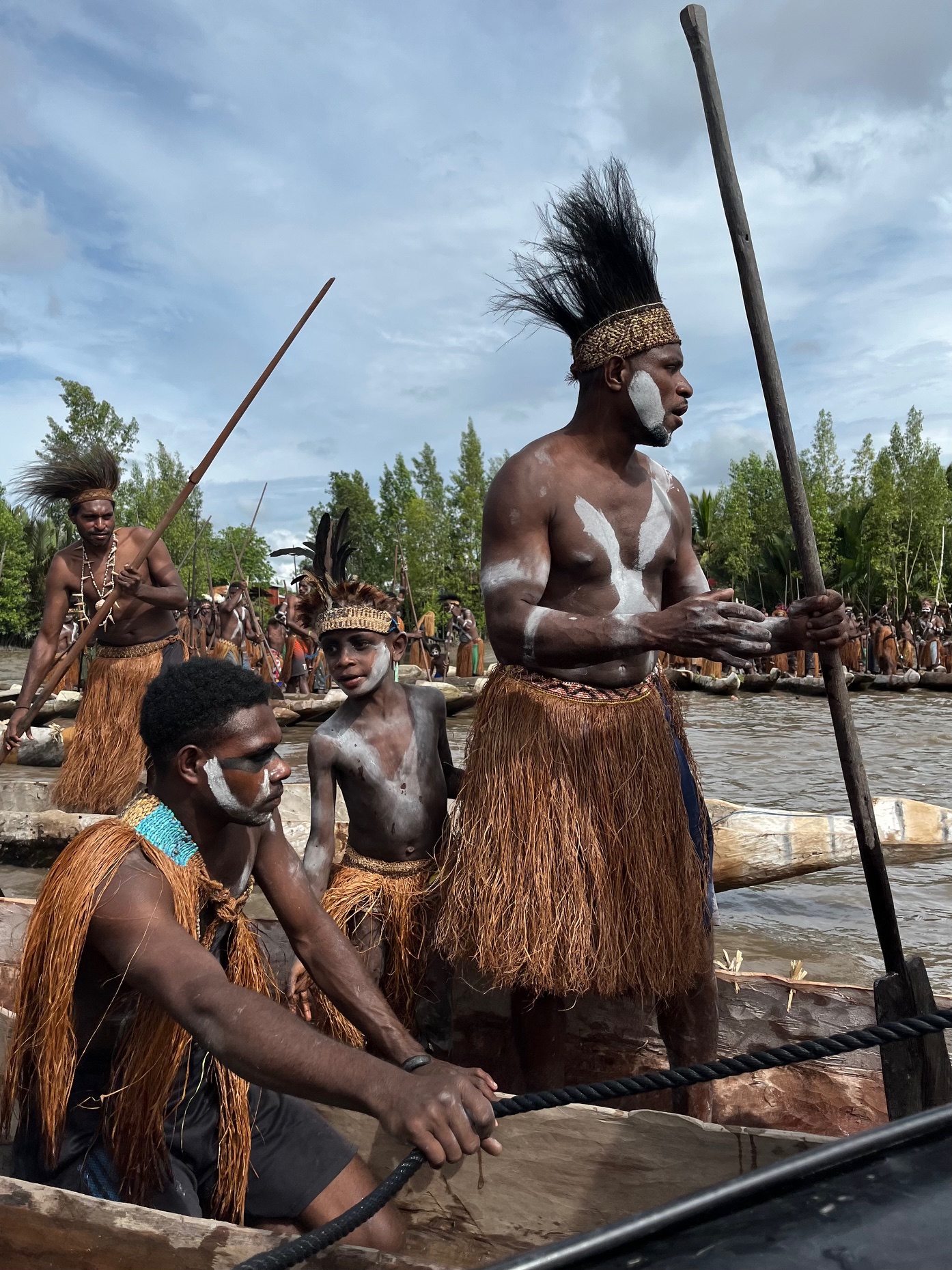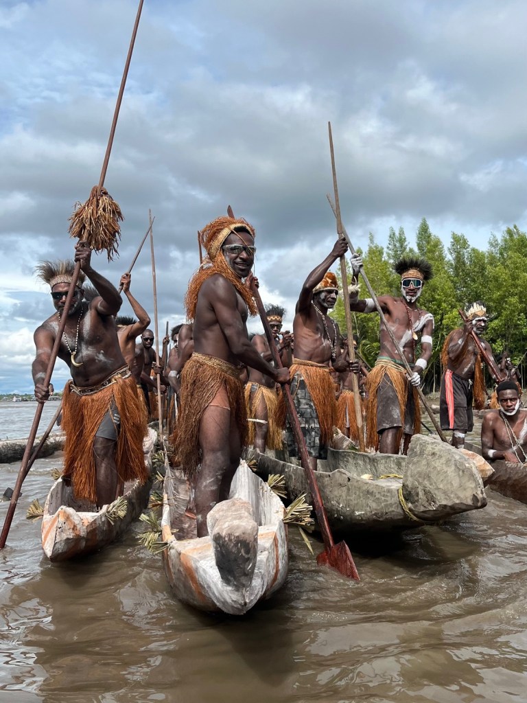 Our zodiacs were surrounded by the warriors, who rhythmically beat their wooden paddles against the sides of the wooden canoes and shouted and sang as they sailed among us.