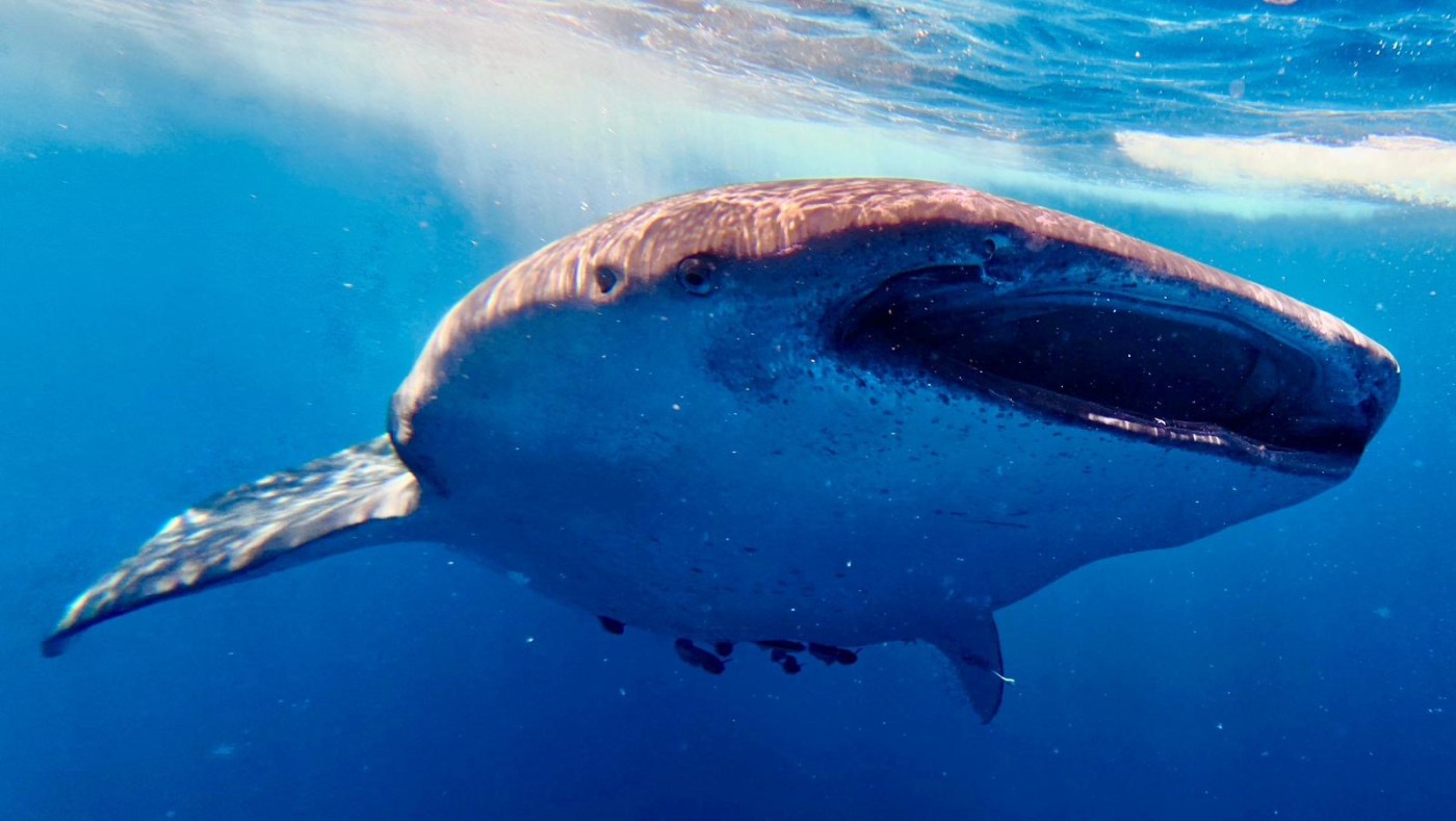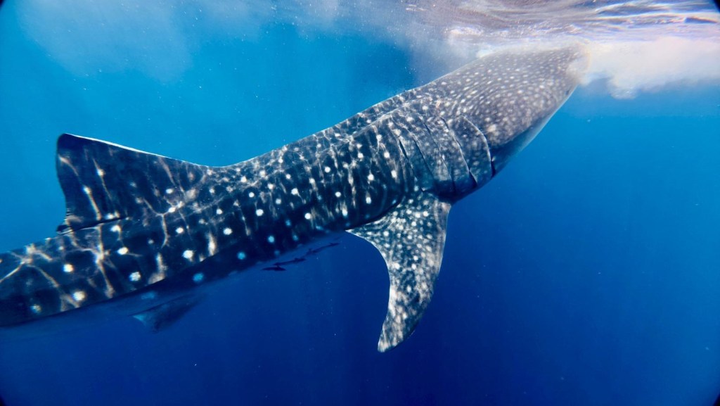 At one point I surfaced to adjust my mask and when I stuck my head back under the water a whale shark was swimming literally an arm’s length below me. It was so close that I starfished myself and froze in position until it swam away.