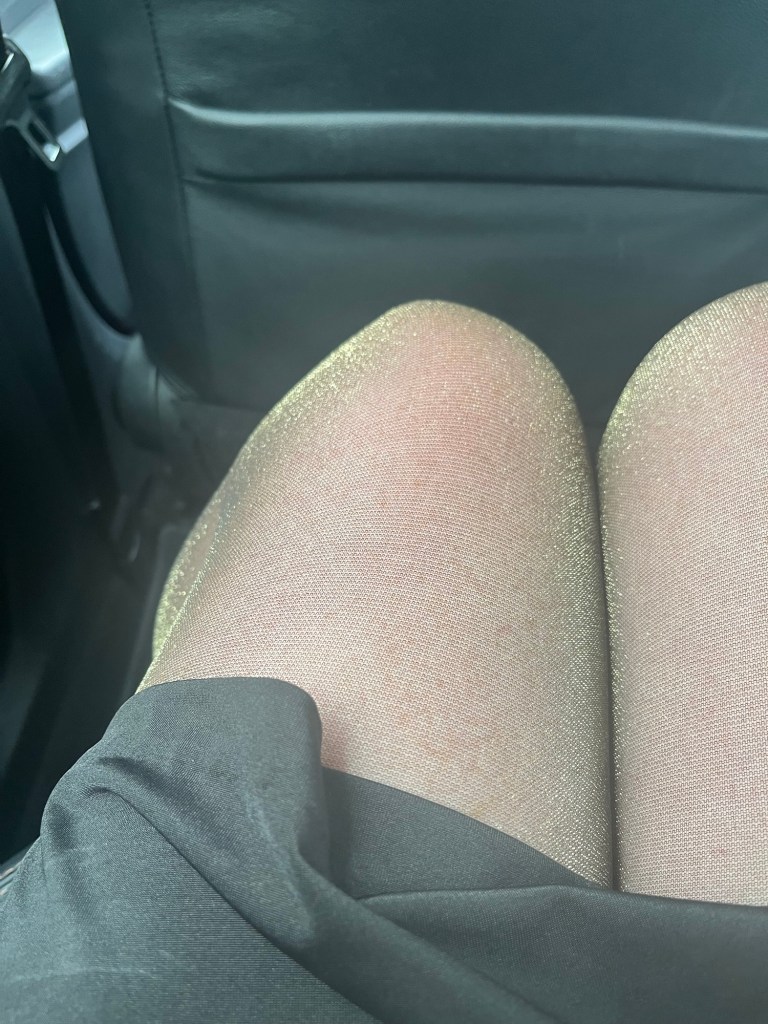 Pic below of my legs in the pantyhose in the cab (hard to capture in photos but very glittery in person) …