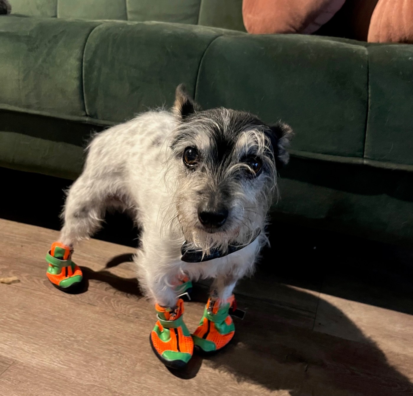 The boots were intended to stop him getting itchy feet – both dogs spend the spring and summer months chewing their toes due to grass allergies – but the experiment failed.