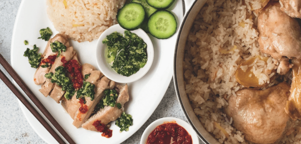 It’s really easy too, you just fry a little ginger and garlic in butter, toss in some long grain rice and stock, bring it to a simmer, place bone-in chicken thighs on top and put the lid on for 14 minutes. Then take the pot off the heat, rest it for 10 minutes and serve with cucumber, homemade ginger and shallot sauce and sambal oelek.