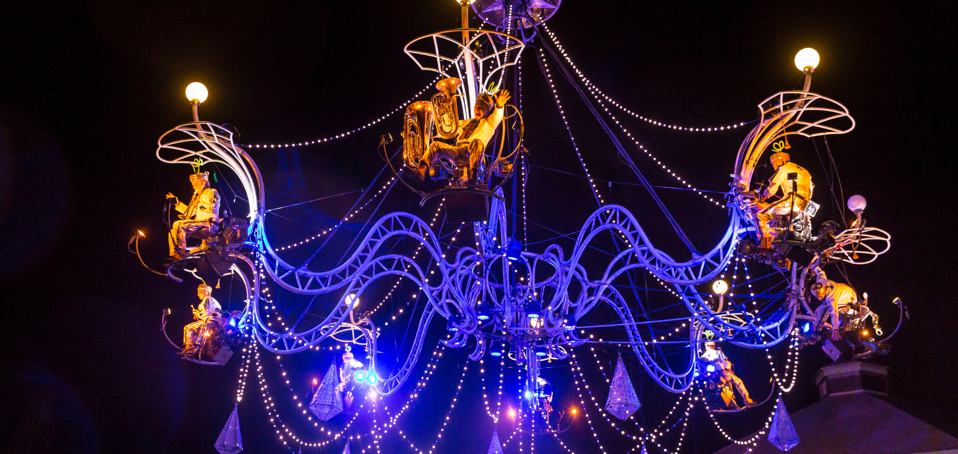 Cristal Palace reimagines the Forecourt as a baroque ballroom, complete with a gigantic chandelier overhanging the stage that is home to an airborne wind orchestra.